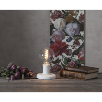 White lamp base with round shapes, made of wood with E27 socket. Combine the lamp base with a stylish light source for an elegant impression. Does well on tables and in windows.