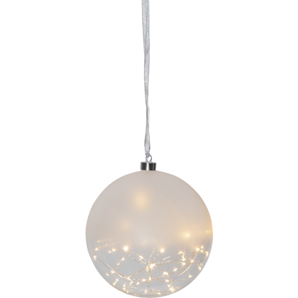 Half frosted glass ball for indoor use with dew drop lights. The light chain has 50 LED. A very nice glass decoration that creates a lovely light.