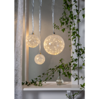 Glass ball for indoor use with dew drop lights. The light chain has 30 LED. A very nice glass decoration that creates a lovely light. Transformer for indoor use