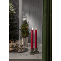 2 pack deep red antique candles in our Flamme Stripe series, made in wax with a ribbed-striped surface. The candles have a very lifelike flame that shines with a warm white glow. They have a timer function which means that the lights shine for 6 hours a day for about 30 days. They are powered by 2 AAA batteries for each candle, these are not included. These candles have a silicone-coated foot that makes the candles stand more firmly in the candle holder. Avoid placing candles in direct sunlight as they can melt and discolor from the heat.
