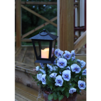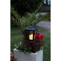 Lantern in black metal with LED-lighting. The candle is battery operated by 1 CR20232 that is included and have a warm white light that looks very lifelike. Size for the lantern 12 x 16 cm and with the ground pin the height is totally 40 cm.
