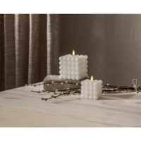 Flamme Dot is a square candle made of white wax with a bubbly surface. The light is about 8.5x9.5cm including the flame. This electric candle will be a beautiful decoration, both alone and in groups together with other candles from our Flamme series. It has a timer function and when the switch is in timer mode, the light shines for about 25 days with a beautiful realistic flame in warm white. It is powered by 2 AAA batteries, these are not included. Avoid placing candles in direct sunlight as they can melt and discolor from the heat.