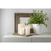 White wax candle with rustic surface in our Flamme series. The true-to-nature flame shines with a warm white glow. With built-in timer. Avoid placing candles in direct sunlight as they can melt and discolor from the heat. Size 7,5x10cm.