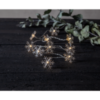 Battery operated indoor light chain with transparent decorations in the shape of snowflakes. Decorative decor that gives a cozy shine in the christmas tree or on the table. Runs by 2 pcs AA batteries (not incl).