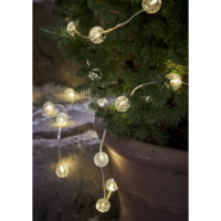 Battery operated light chain with 50 warm white LEDs and clear ball decorations. Battery box for outdoor use with 8 chaser function and timer. Lovely light chain to decorate in the garden for everyday and party. Gives a beautiful glow in the dark.