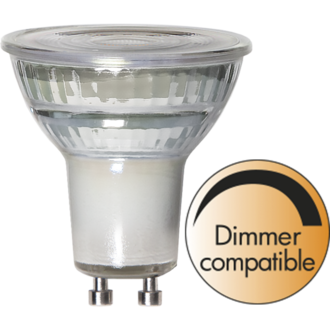Dimmable GU10 LED Spotlight in glass. Colour temperature is warm white, 2700K.
